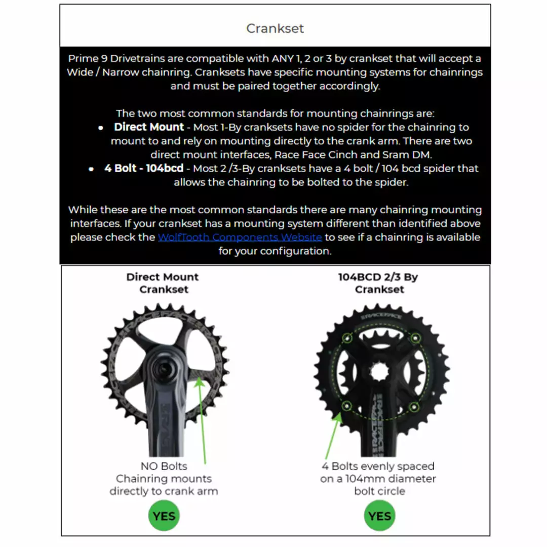 Works with 10,11, or 12-speed Shimano, SRAM, and most other brands’ narrow/wide chainrings (you must use a Prime 9 chain).