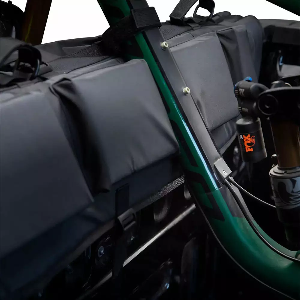 Get the Fox Factory look with the Overland Tailgate Pad to keep your bike safe and your ute protected. The heavy-duty PVC tarpaulin on the outside is super durable, and the micro-brushed inner lining will keep your tailgate scratch-free. The padded raised bumpers and adjustable downtube straps will keep your bikes separated (…you gotta keep ’em separated) and there is room for up to 6 bikes.