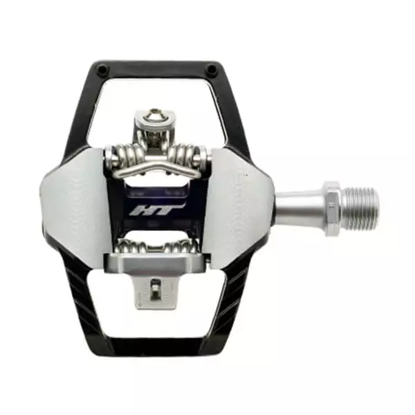 These pedals have a wide and long platform for improved control, giving you confidence and making it easier to navigate the trails. The integrated cage helps protect the binding system from impacts on rocks or roots and sheds mud with ease, whilst allowing ample room to engage with your cleat. They even have replaceable pins for when they become worn. These pedals come complete with a pair of HT cleats.