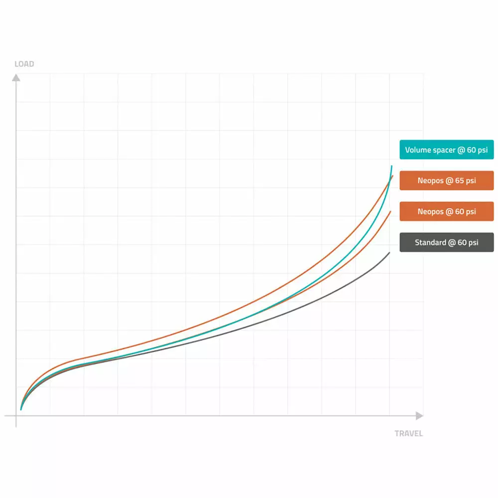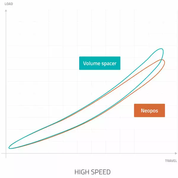 If you think of the Neopos as an air volume spacer that can be compressed, the Neopos makes it possible to make the air forks progression curve more linear, thus avoiding the excessive progressivity given by the traditional volume spacers. With the Neopos you get all the support of a traditional volume spacer halfway through the travel, but without the abrupt ramp in the final part of the compression curve. The progression curve will always remain gradual, allowing you to use all the available travel of your fork. A more linear curve, using all the available travel. Sounds like a coil, right?