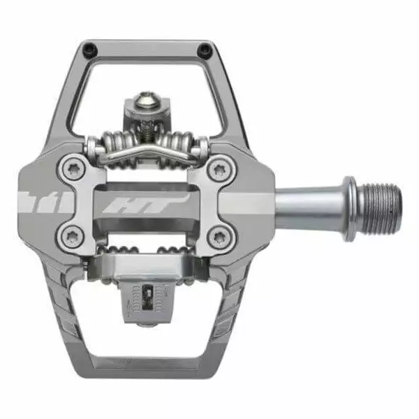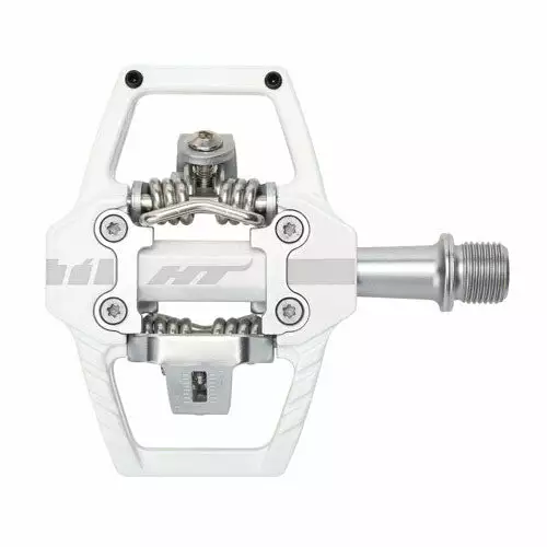 Utilising a large CNC machined aluminium body with 2 pins per side, the T1 gives you amazing grip and support.  To ensure the pedals hold up to the abuse they see on techy trails in all weather conditions, HT uses their EVO + bearing system.  This consists of a needle bearing and bushing per pedal.  With an adjustable spring tension and the included 4° float cleats, you’ll notice the improved control right off the bat!  Works best with all-mountain and gravity style shoes.Â