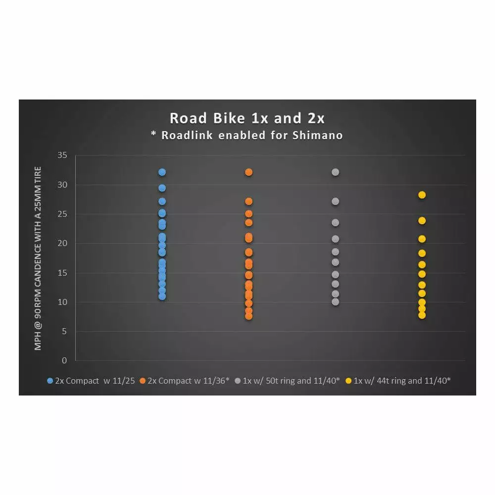 The RoadLink repositions road derailleurs so they are able to accept MTB cassettes. This is perfect for converting road drivetrains to 1x without sacrificing the range of a double. It can also be used to increase the range of standard doubles.