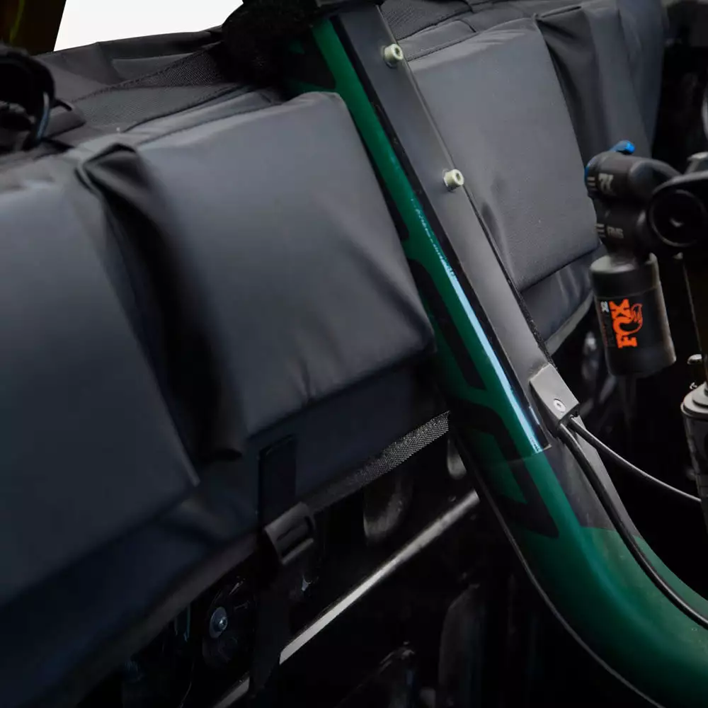 Any Special Features: The top edge has 6 adjustment straps to provide a tailored fit to your tailgate’s shape, even if it’s curved. Adjustable rear camera panel. Raised bumpers keep the downtubes secure, minimising bike on bike contact while shuttling.
