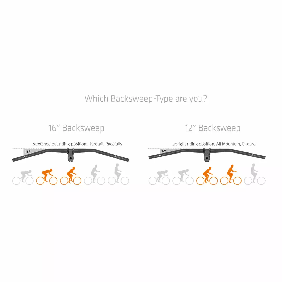 These bars use a larger backsweep than is found on most MTB bars. The shorter reach created provides a natural transition from the lower arm to the hand when in a more upright riding position and protects the wrist from the extreme strain that can occur in downhill riding.